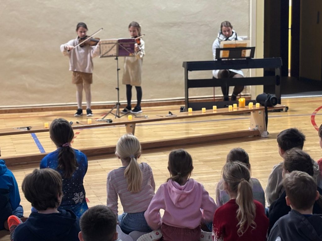 Mit einem Rhythmical sorgte die 2b für Stimmung, ehe die ganze Schulgemeinschaft einem Geigenduett lauschen durfte.