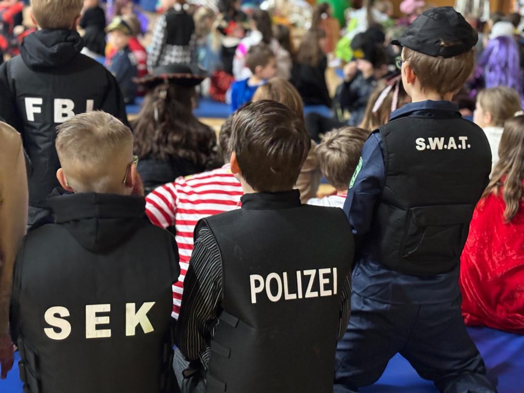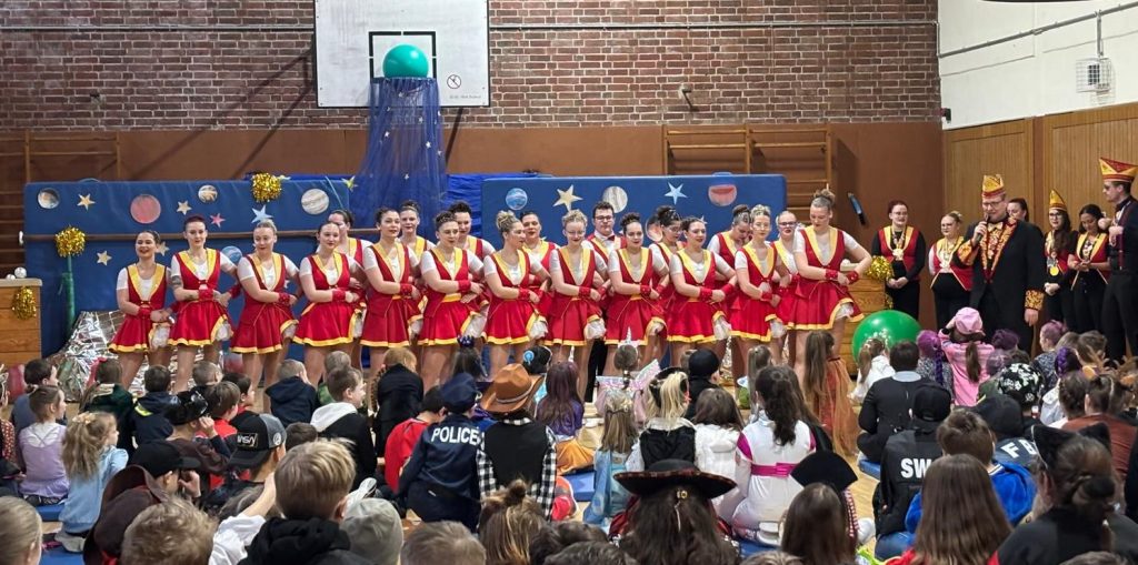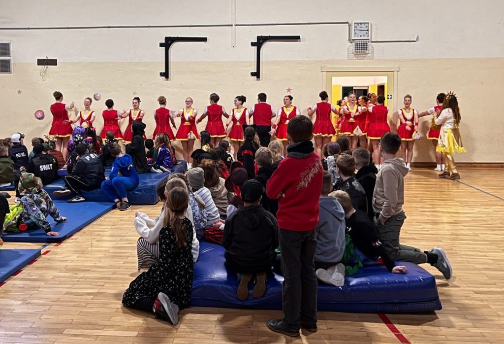 Nach der Verleihung einiger Karnevalsorden stand für die Kinder zunächst die Frühstückspause in den Klassenräumen auf dem Programm, ehe mit einer Polonaise alle Schülerinnen und Schüler zurück in die Sporthalle geholt wurden.