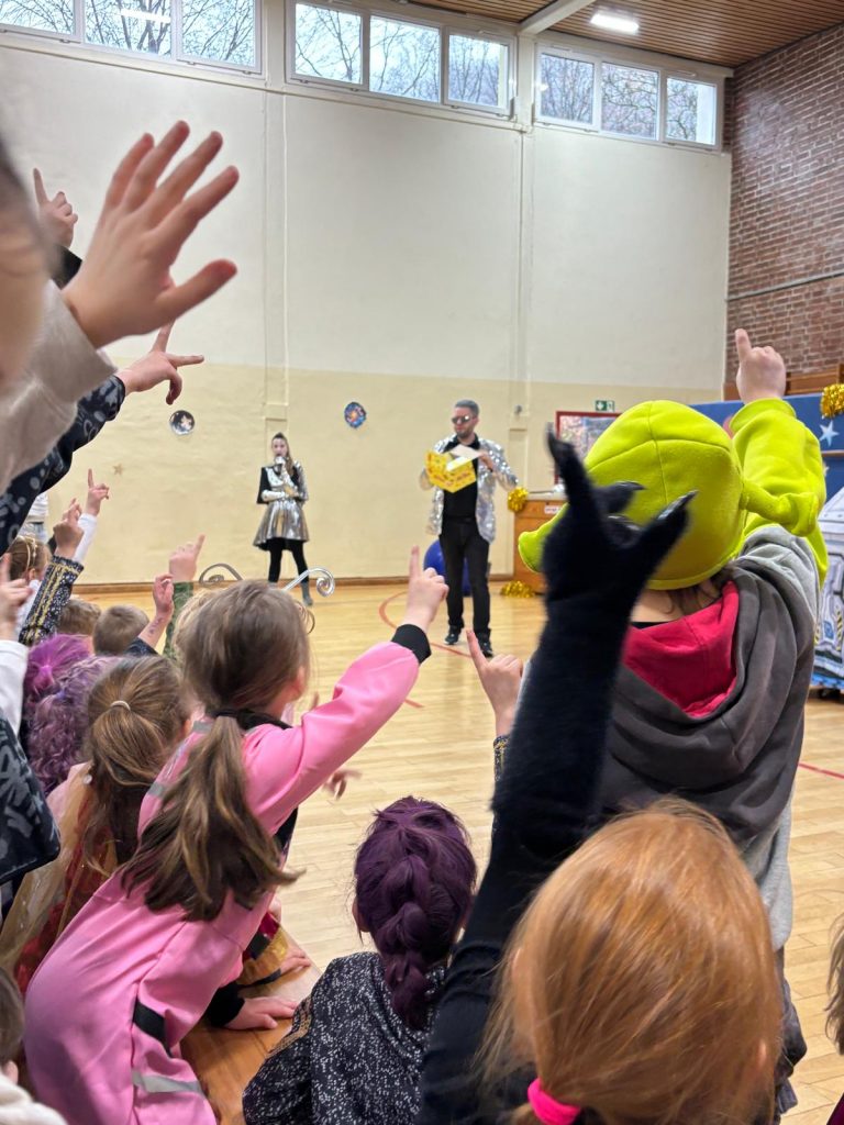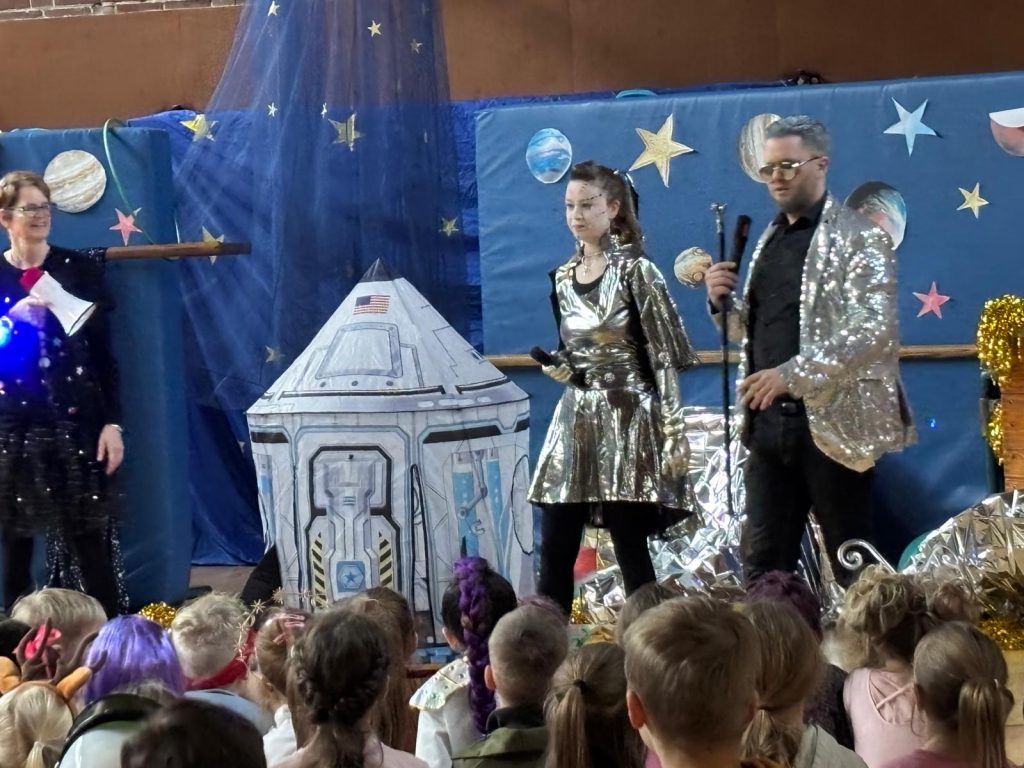 Dort nahmen Herr Luke, Frau Fehrenbach und Frau Eckstein die Kinder und das Kollegium mit auf eine phantasievolle Reise in die Weiten des Alls.