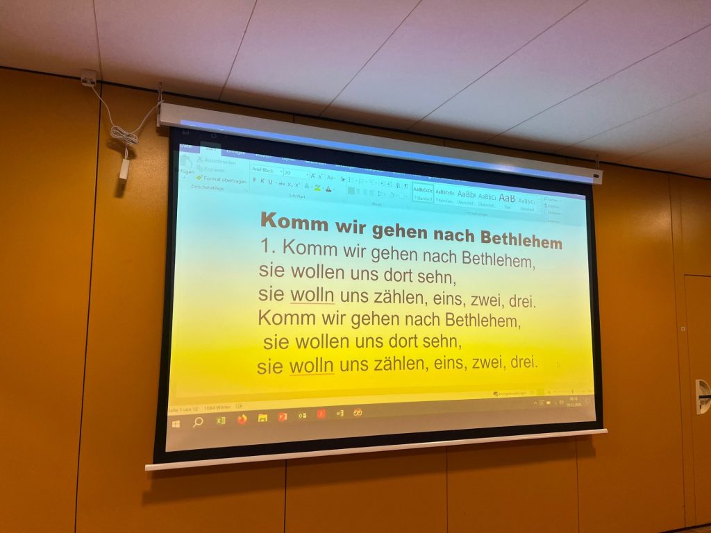 Die Weihnachtserzählung war als Mitmachgeschichte zu hören. Jedem und jeder wurde eine Rolle als Maria, Josef, Hirte, Schaf oder Engel zugewiesen. So ging es bei uns im Forum sehr lebhaft zu.