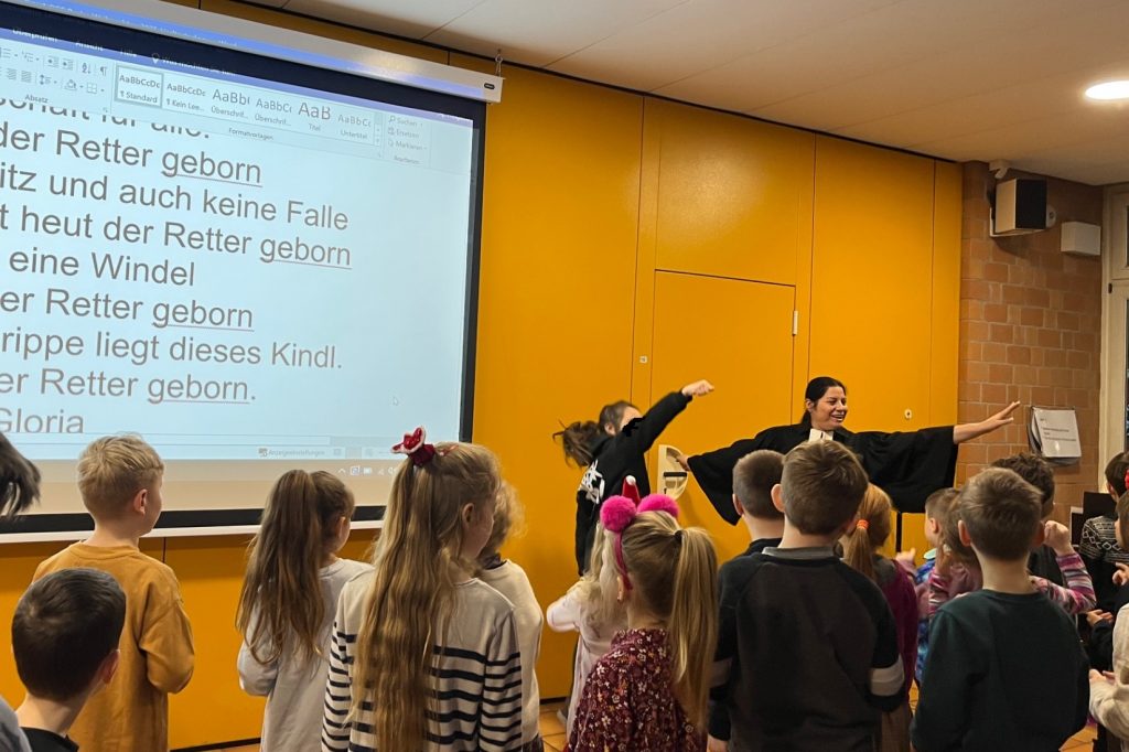 Zum Schluss sorgte das Lied „Weihnachten ist Party für Jesus“ noch einmal für richtige Partystimmung, ehe die Kinder ein Stück Schokolade bekamen und zurück in ihre Klassen gingen.